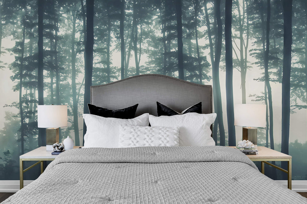 Tall trees rise into a misty sky, creating a sense of wonder and stillness for any serene space.