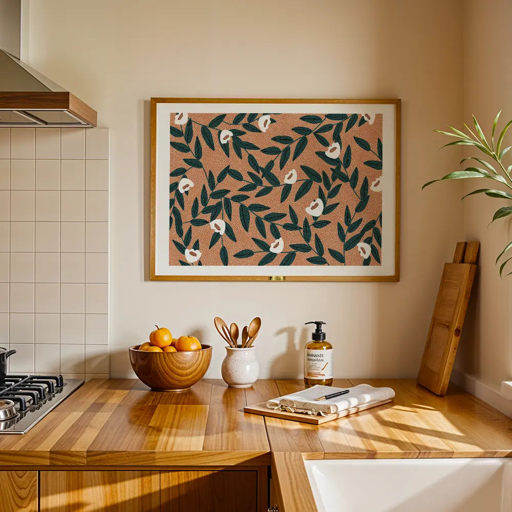 A calming botanical pattern with delicate leaves and blossoms that evoke natural elegance.