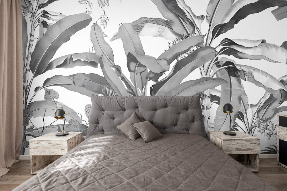 Monochrome tropical leaves and florals create timeless botanical elegance.
