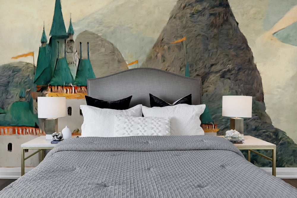 A dreamy castle with green spires set against misty mountains; a whimsical escape into a fairy-tale land.