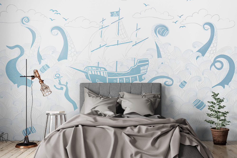 Dive into an ocean fantasy with playful waves and a pirate ship that sparks imagination and wonder.