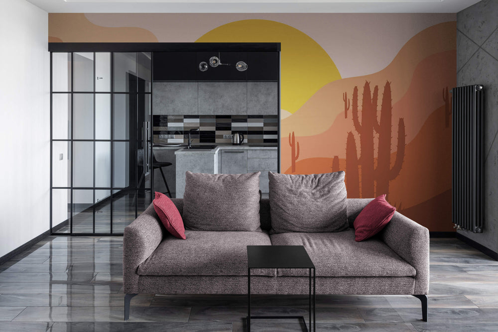 A warm desert landscape basking in the golden glow of a setting sun, perfect for serene spaces.