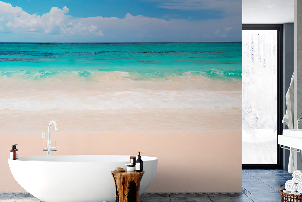 Rolling turquoise waves meet sandy shores, invoking the peaceful rhythm of the ocean.
