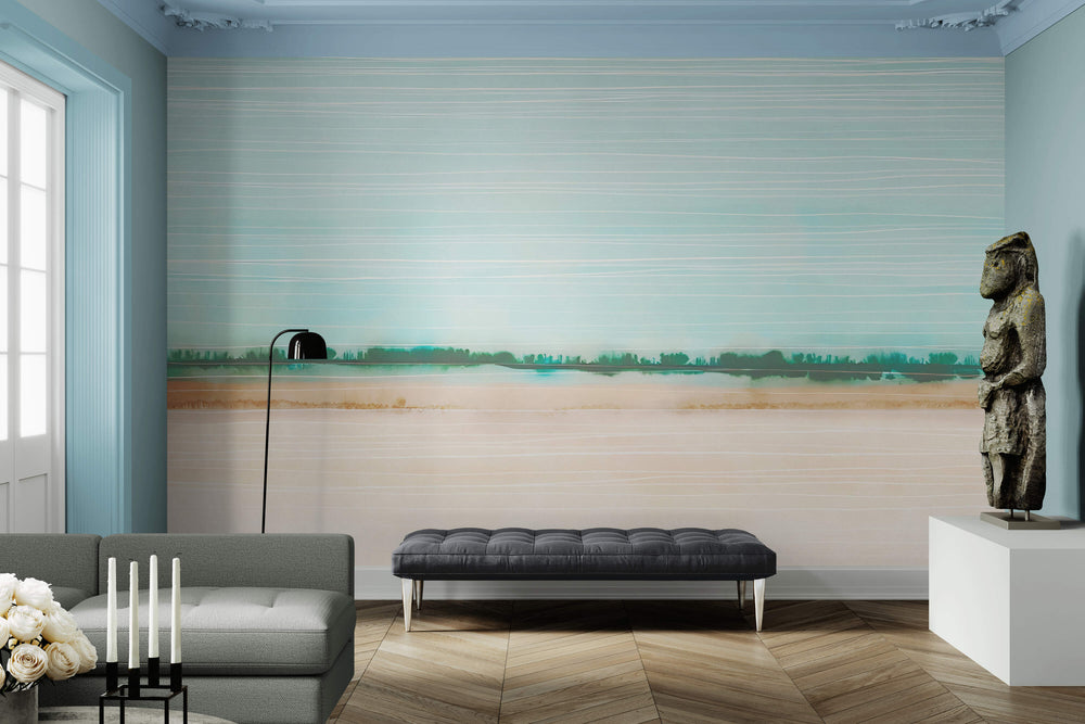 A minimalist horizon in calming blues and beige tones, evoking peaceful infinity.