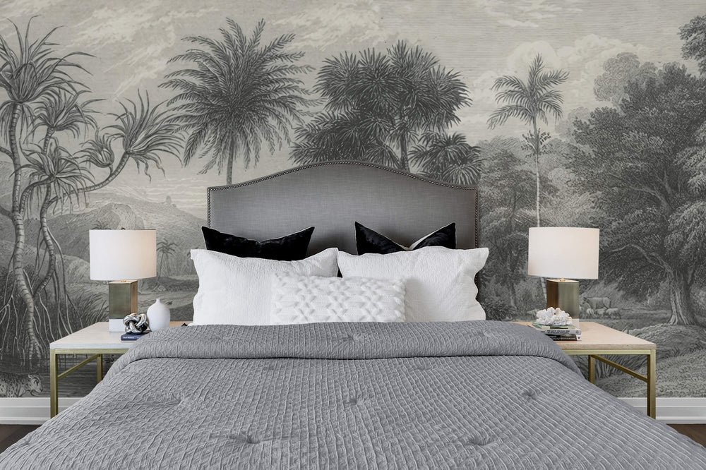 An intricately detailed forest etching with palm trees and lush foliage that evokes timeless tranquility and serenity.