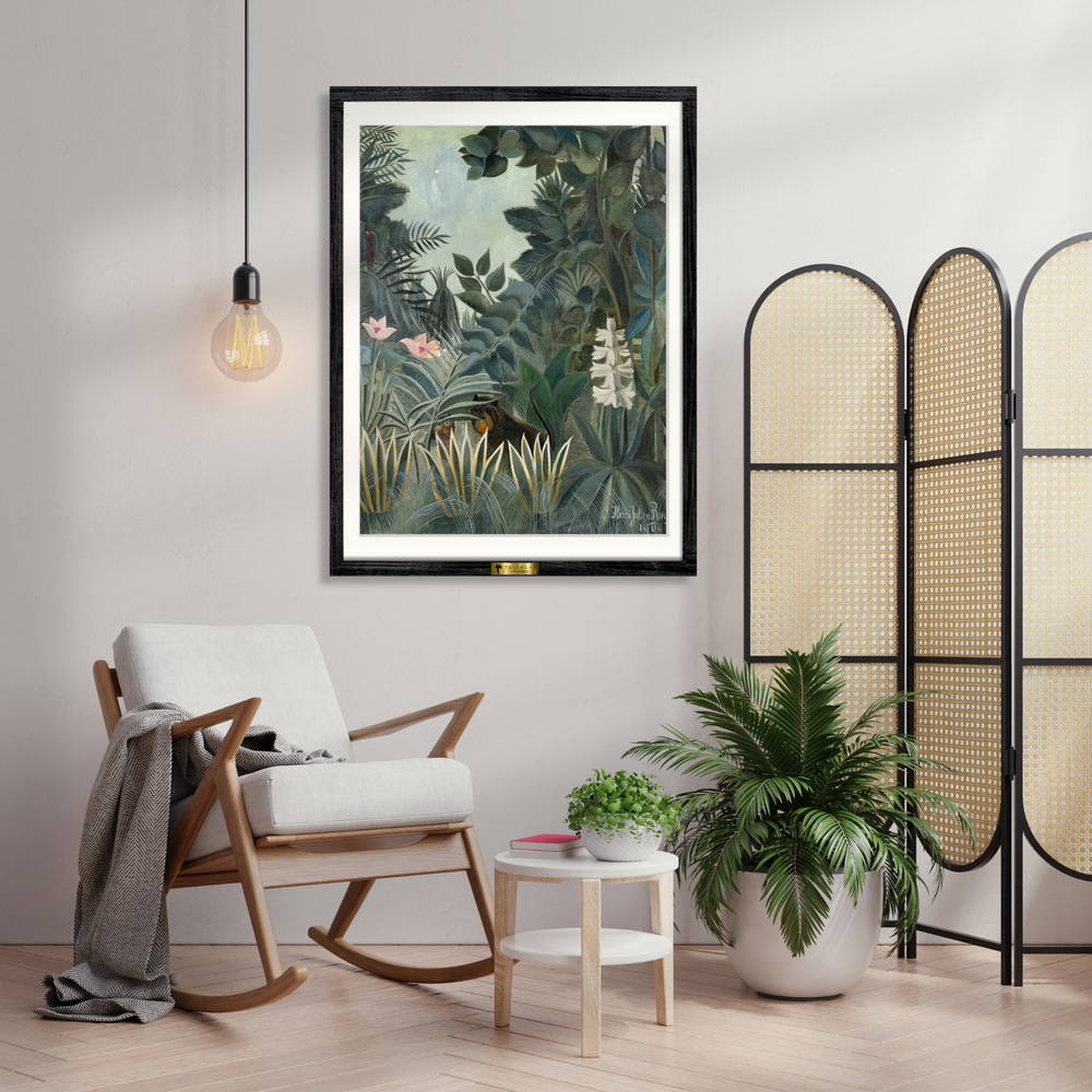 A dreamlike jungle scene filled with lush foliage, delicate flowers, and watchful creatures. Rousseau’s work blends elements of fantasy with intricate natural details, creating a magical atmosphere. It’s a celebration of nature’s mystery and the artist’s imagination.