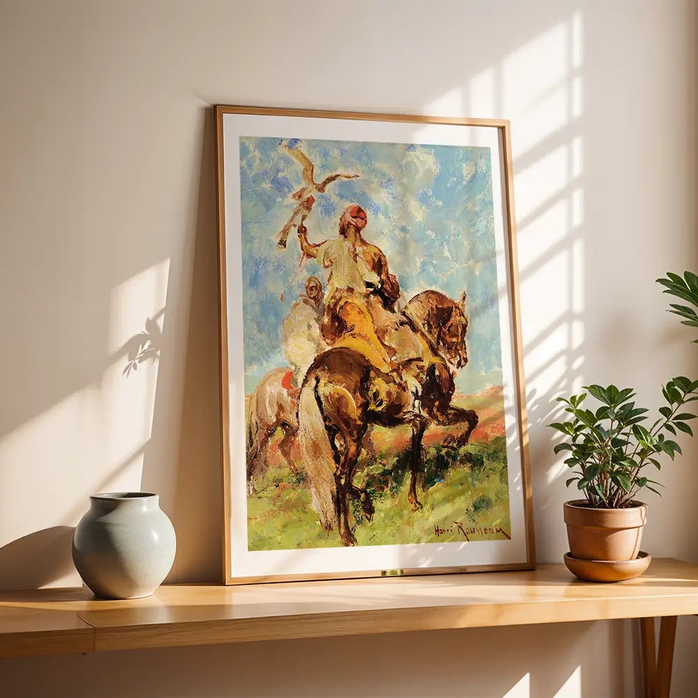 A vibrant depiction of a falconer on horseback with the sky swirling in motion, exuding power and grace.