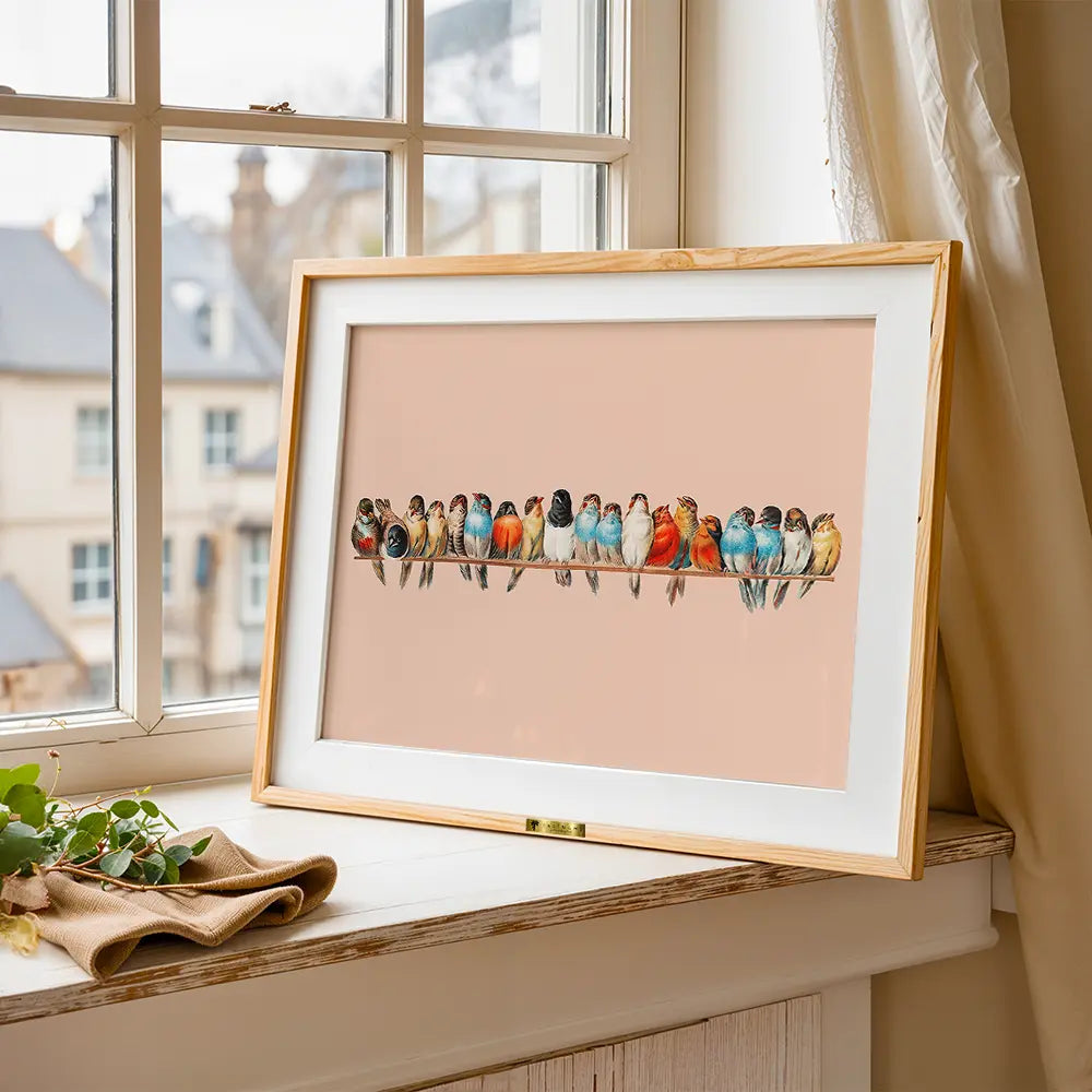 A vibrant assembly of birds perched together, singing the melody of natures charm and unity.