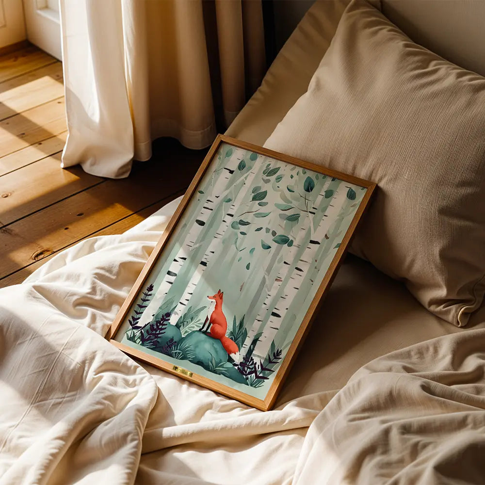 A bright fox seated in a tranquil birch forest minimalist yet bursting with personality.