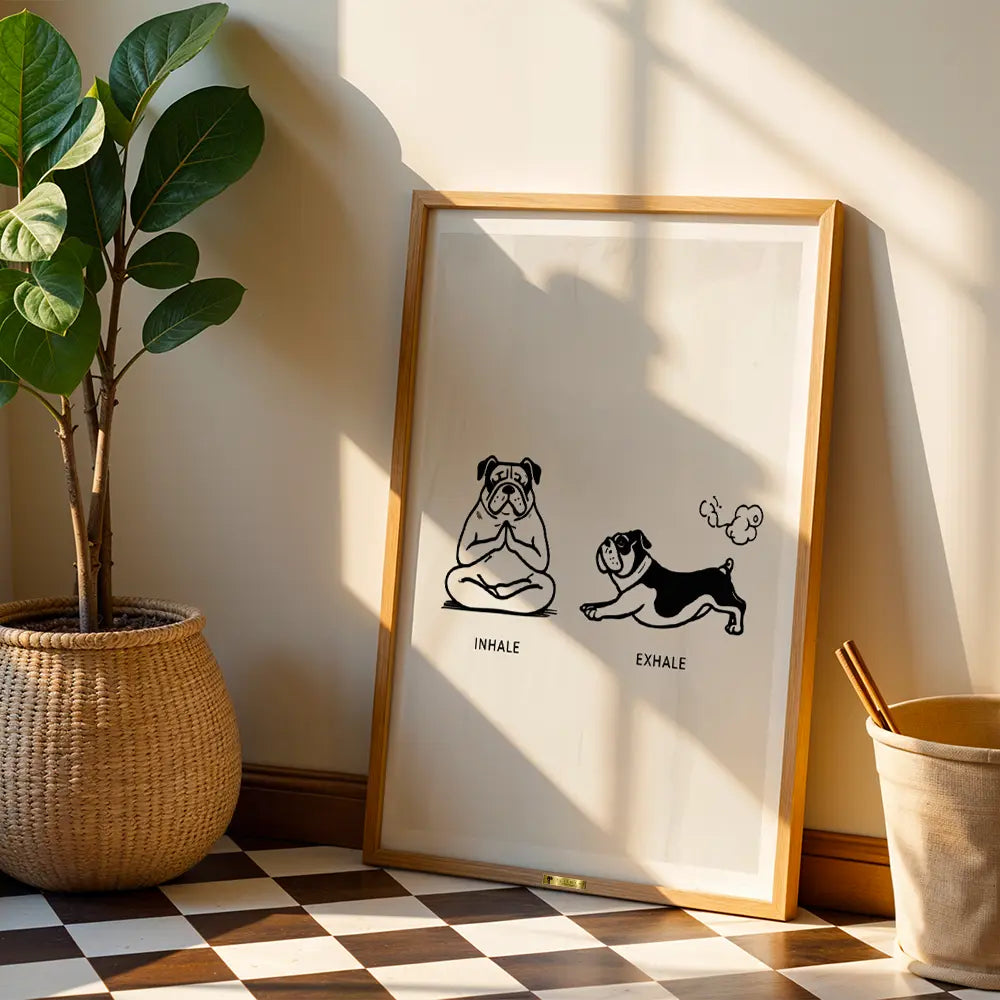 A humorous take on mindfulness with a dog practicing yoga poses, radiating calm.