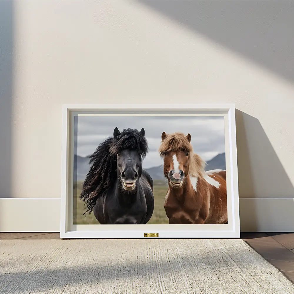 Two expressive horses, one black and one brown, share an unfiltered moment of laughter in a serene field.