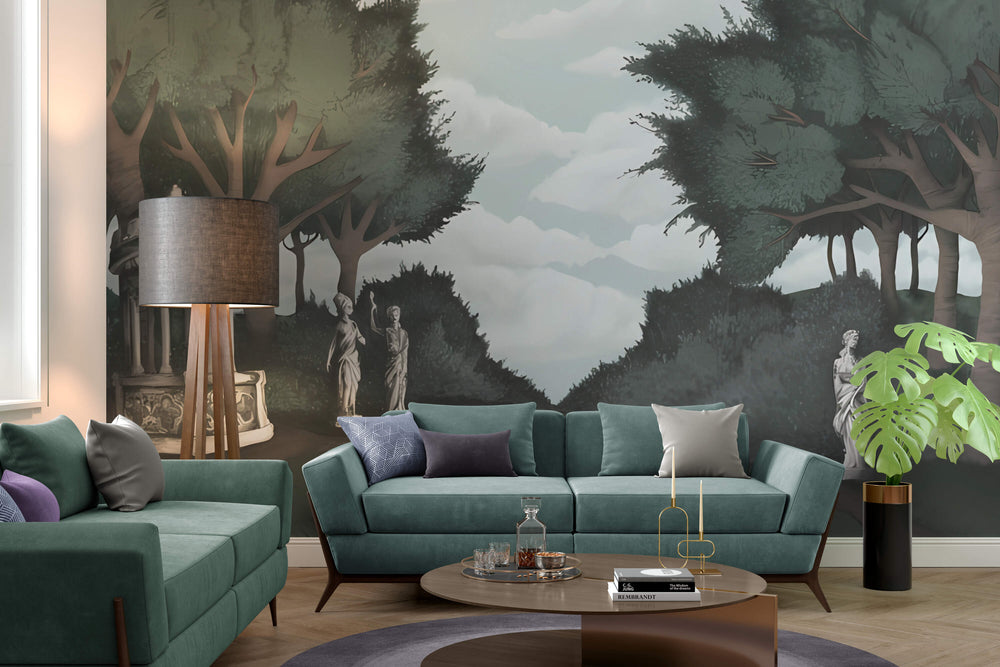 A classical garden scene surrounded by lush greenery and timeless stone statues.