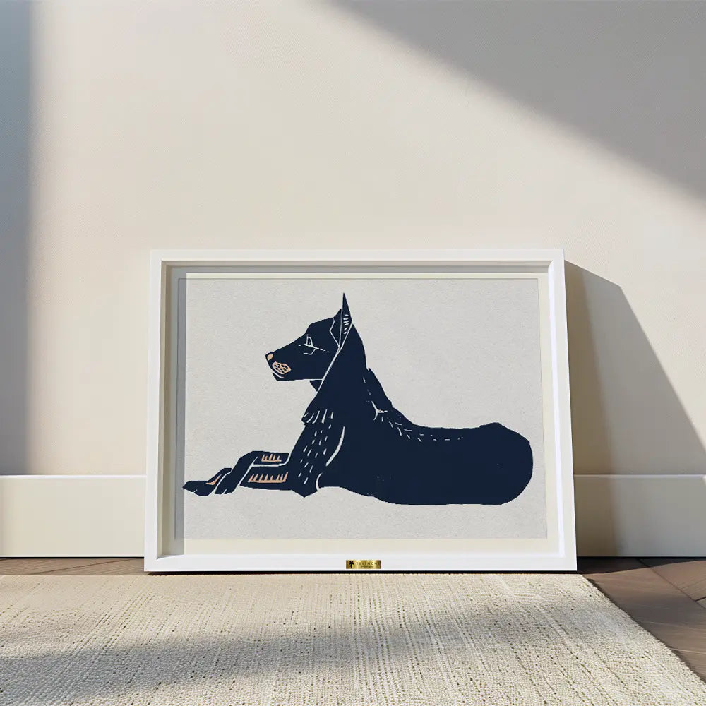 A minimalist black-and-white depiction of an Anubis-like dog in repose.