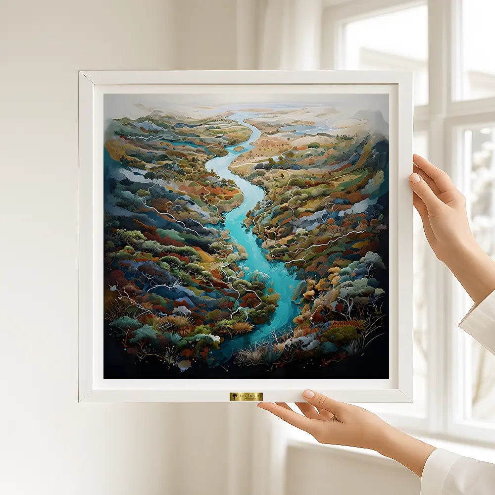 A majestic river winding through colorful landscapes, capturing the beauty of nature in motion.
