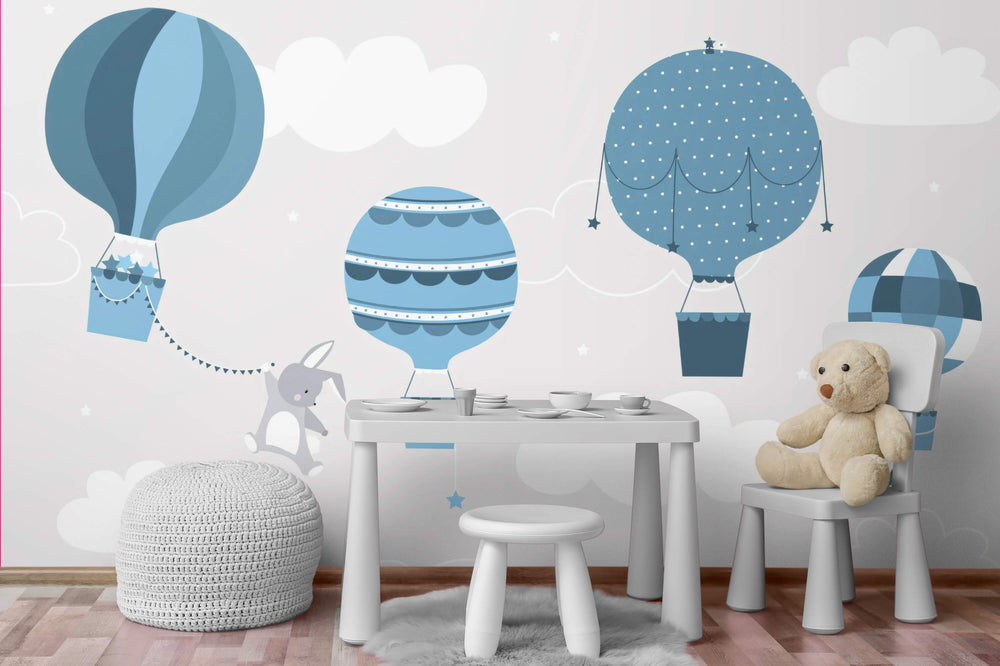 Soft blue hot air balloons drift across fluffy clouds, evoking lighthearted joy and imagination.