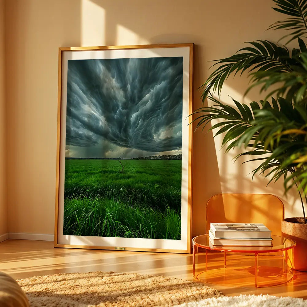 A dramatic storm gathers over lush green fields, capturing nature's raw power.
