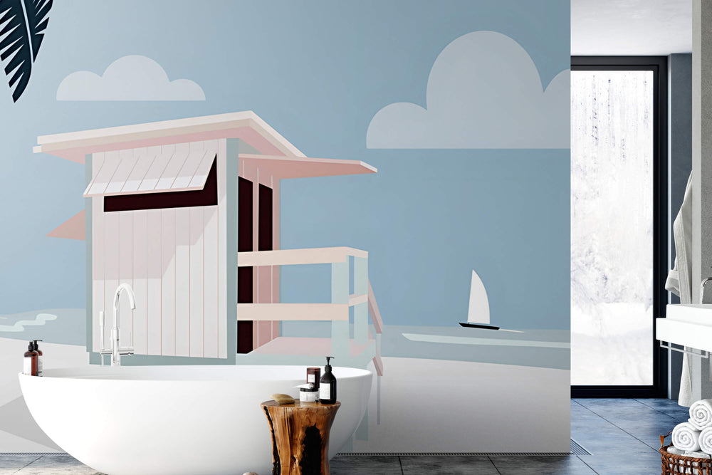 An idyllic beachside escape with a pastel lifeguard hut and surfboard, perfect for creating a serene and relaxed vibe.