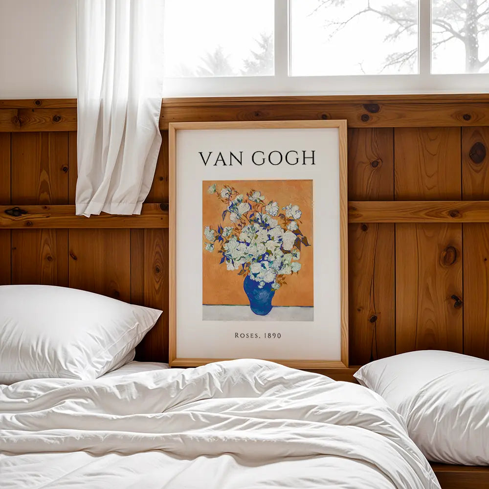 This vibrant still life showcases delicate white roses arranged in a striking blue vase. The warm orange backdrop highlights the freshness of the blooms, creating a dynamic yet soothing composition. It reflects van Goghs love for nature and his ability to capture its essence through bold colors.