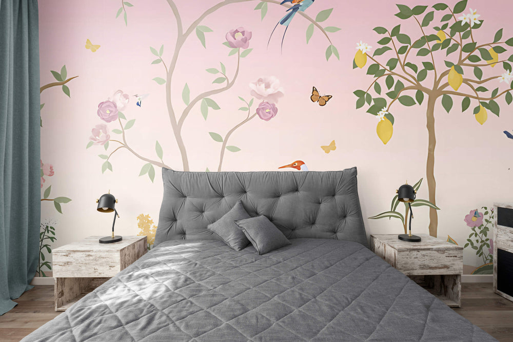 A pastel-toned garden mural with blooming flowers and charming birds for tranquil elegance.