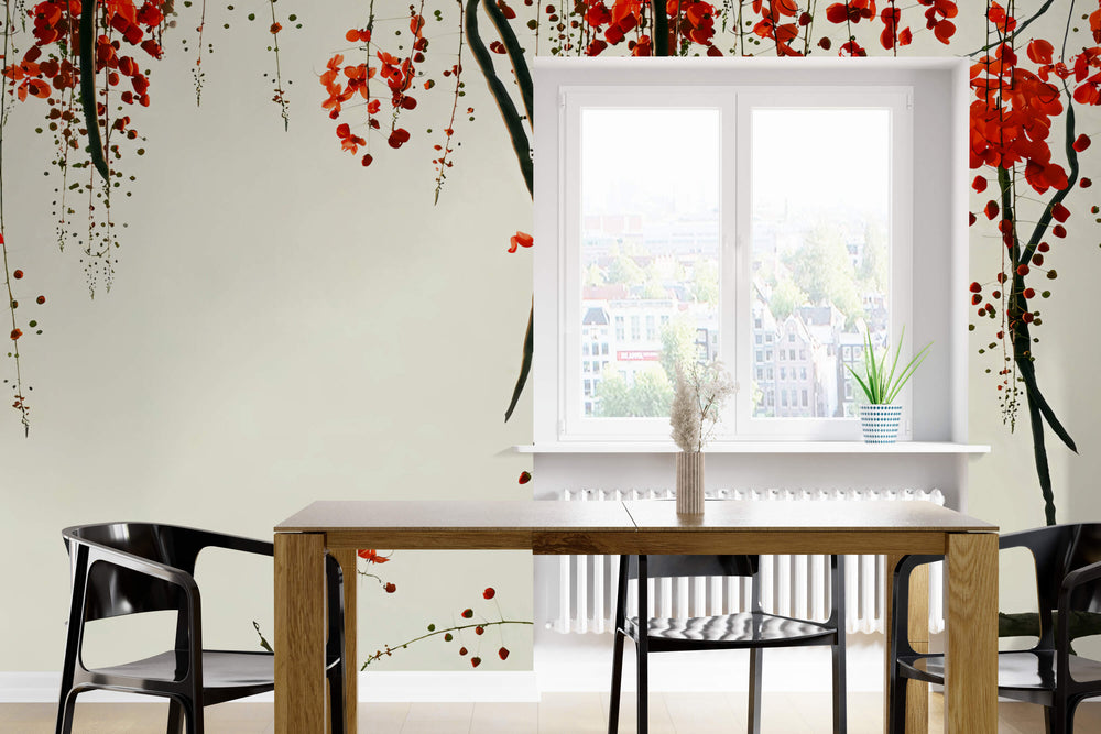 A serene cascade of scarlet blooms hanging gently, evoking natures tranquil beauty and peace.