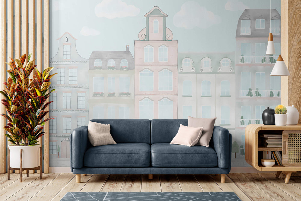 A delicate pastel cityscape with dreamy buildings under soft clouds, radiating serene calm.