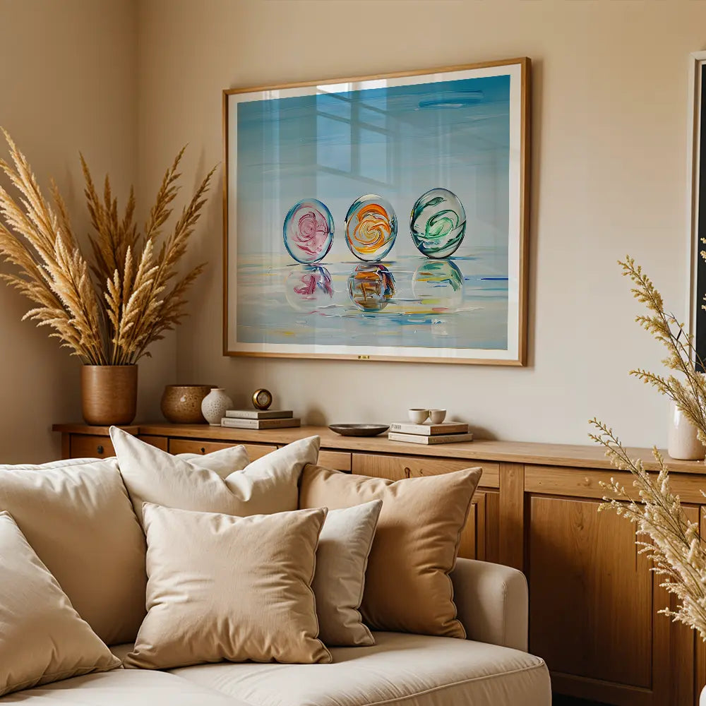 Colorful marbles on a reflective surface with a tranquil blue background, creating a minimalistic harmony.