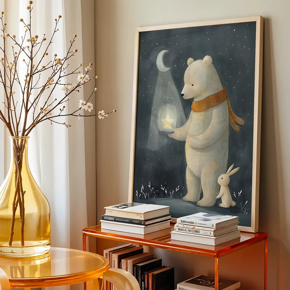 A bear and bunny sharing a glowing lantern under a starlit sky.