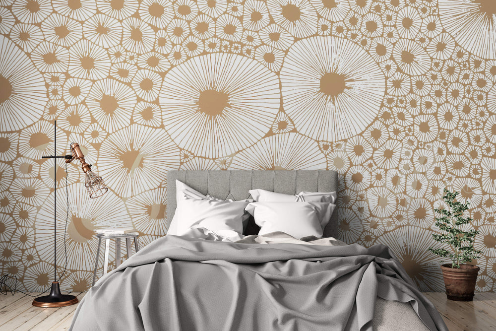Radiating circles in an abstract style bring energy and warmth to any space with their unique texture and flow.