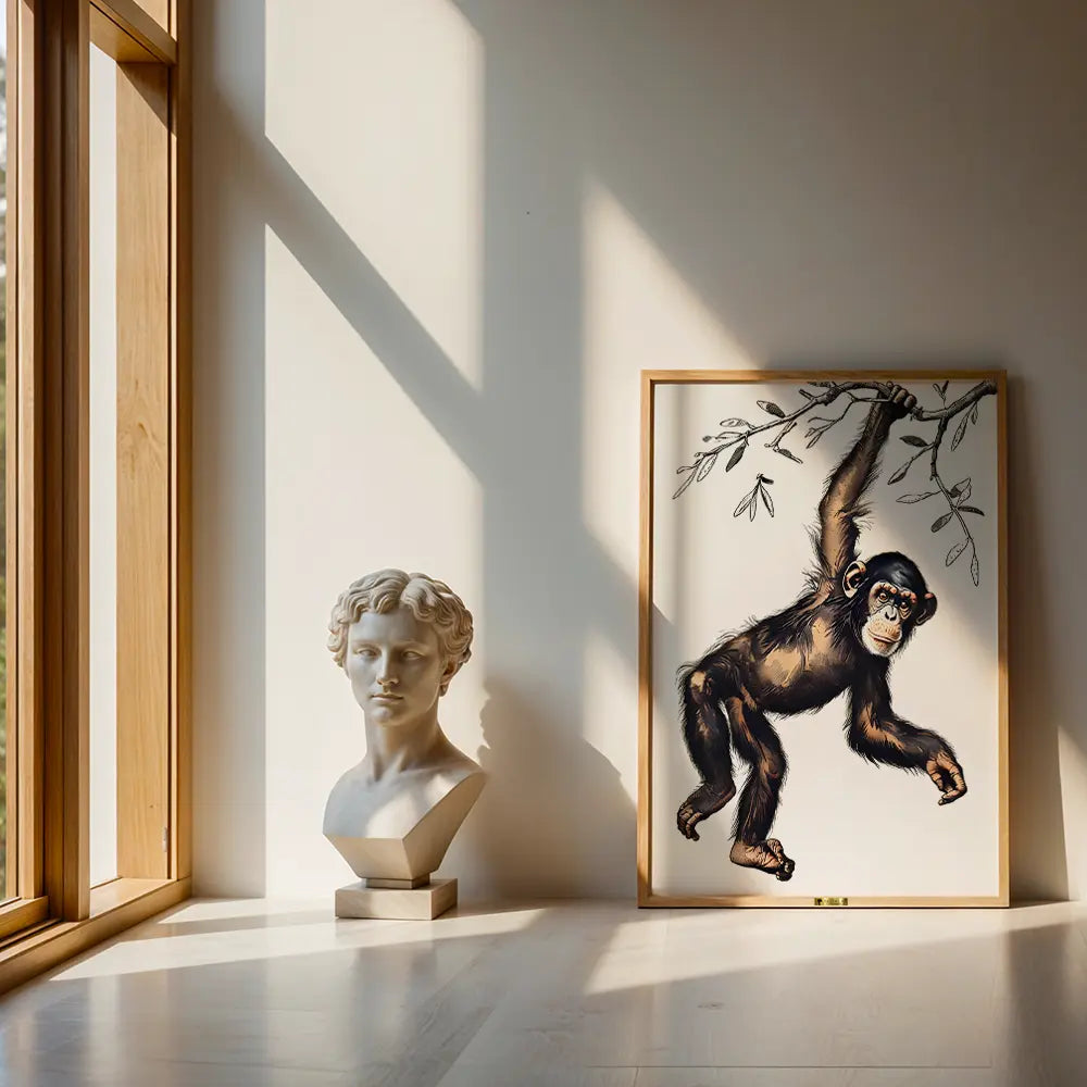 A playful chimpanzee hanging from a tree branch, full of fun and energy.