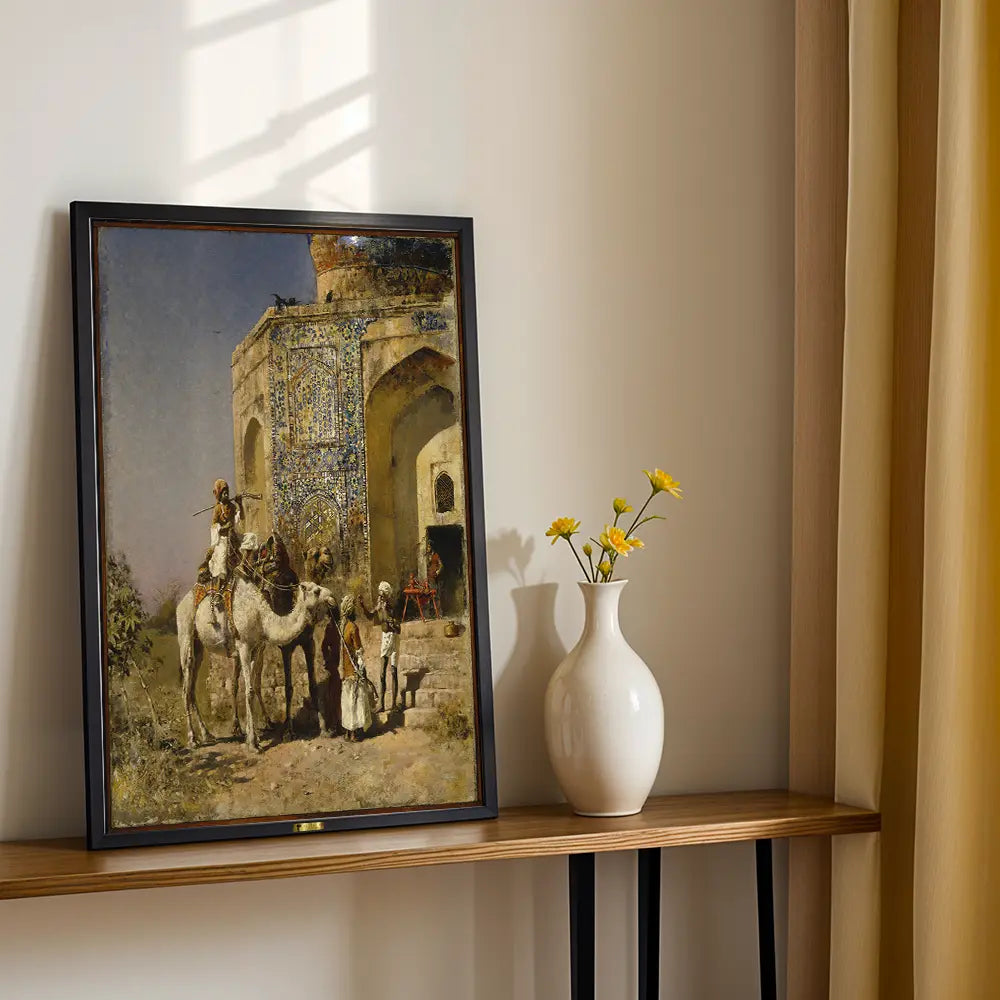 This artwork showcases a gathering near a fortress, where people and animals coexist in a lively scene. The attention to architectural details reflects historical significance and grandeur. The overall composition celebrates community life within the shadow of an imposing historical structure.