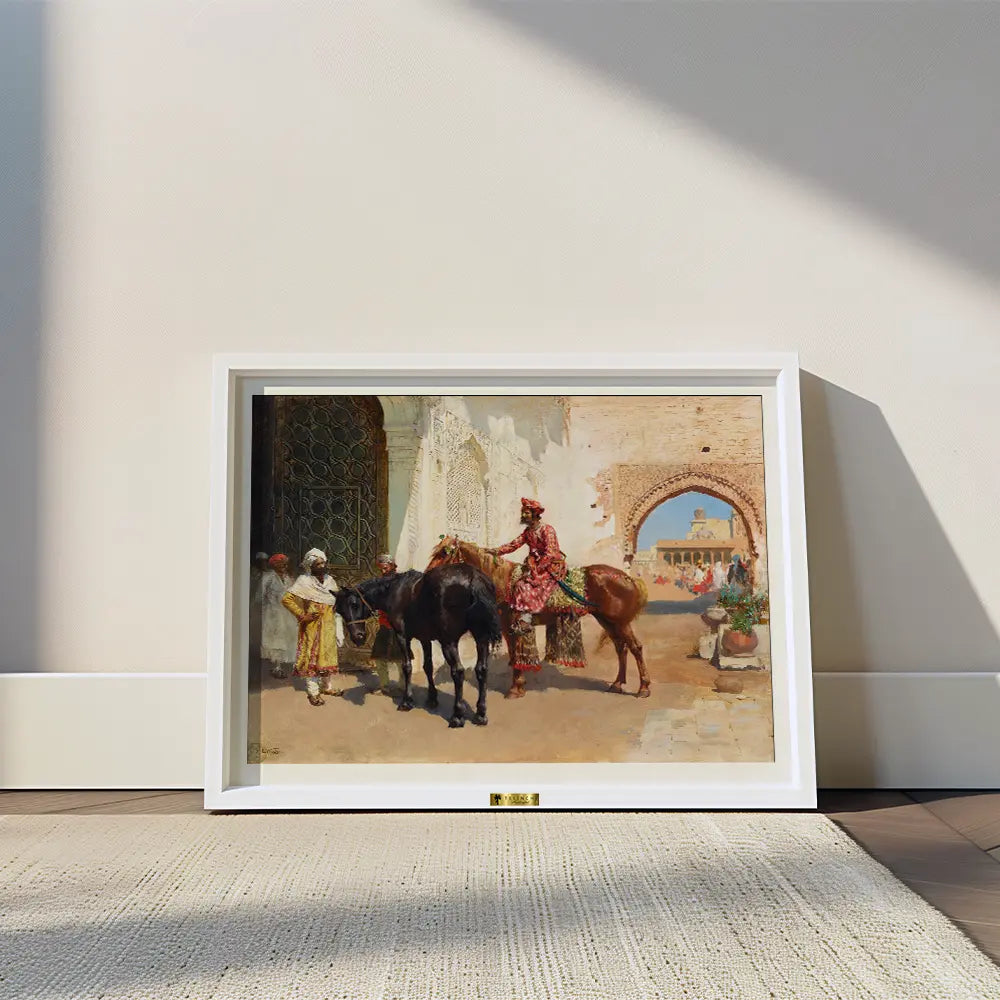 This serene painting showcases a courtyard with marble arches and people engaged in quiet activities. The soft interplay of light and shadow creates a peaceful atmosphere, emphasizing the beauty of traditional architecture. The work resonates with cultural tranquility and timeless elegance.