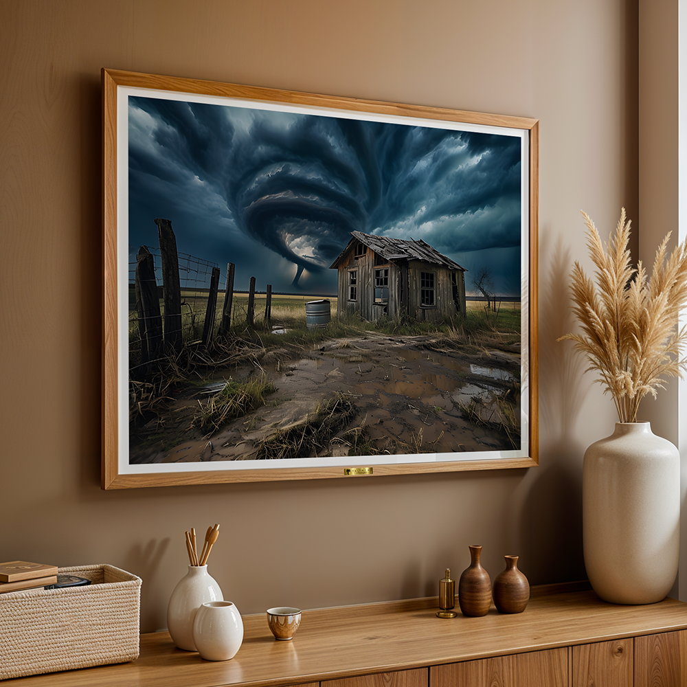 A haunting storm swirls above an abandoned house, capturing nature's raw, untamed power.