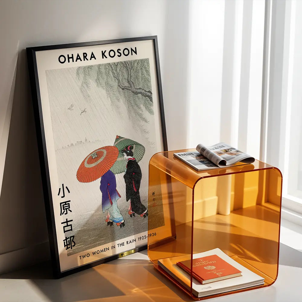 This Japanese woodblock print depicts two women gracefully walking under umbrellas during a rainy day. The muted tones of the background and fine detailing of the figures create a serene and contemplative scene. It encapsulates the beauty of everyday life and the harmony of nature.