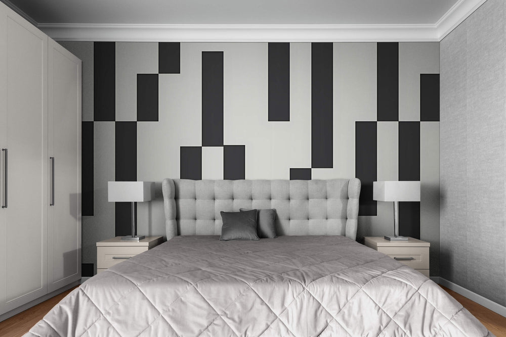 A rhythmic play of black vertical patterns on white, modern and energizing for dynamic spaces.