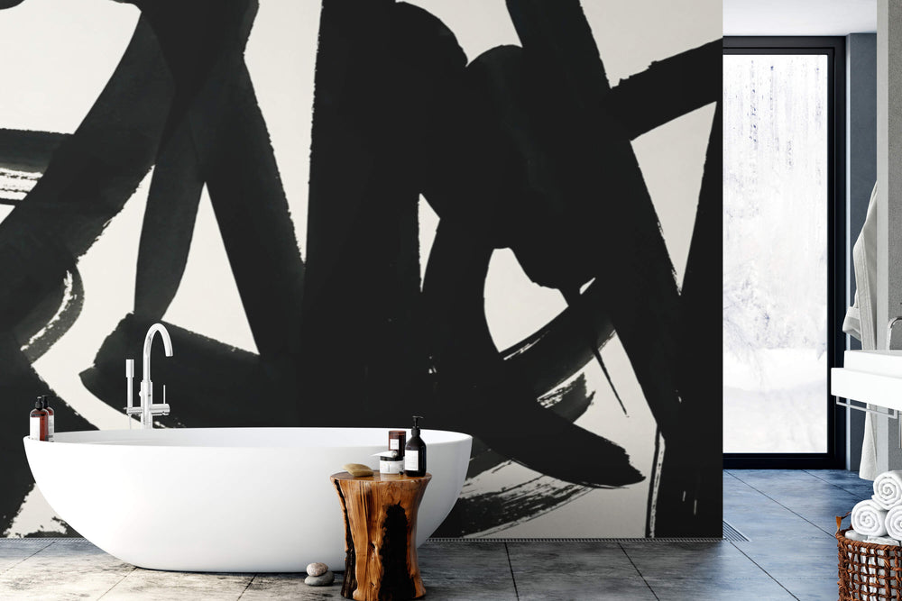 Thick, expressive black brush strokes create a striking statement of modern minimalism.
