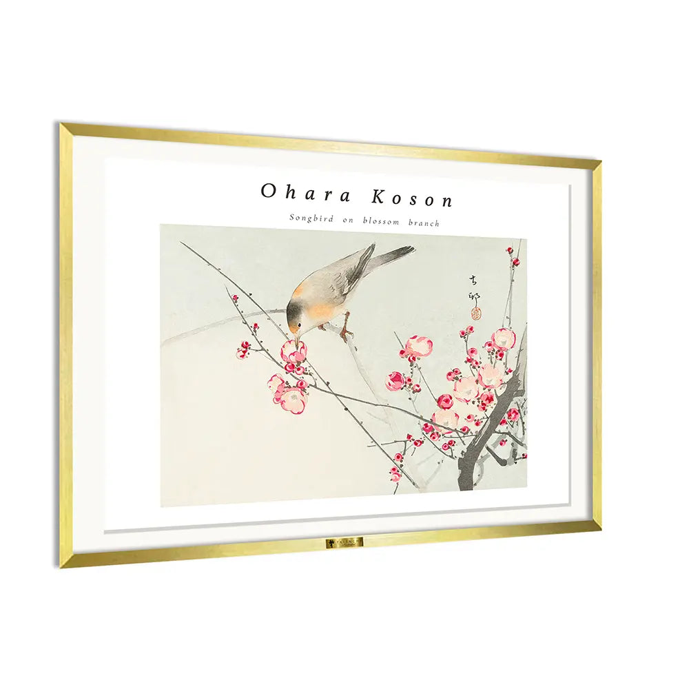 A bird peacefully perched among delicate blossoms, radiating calm and elegance.