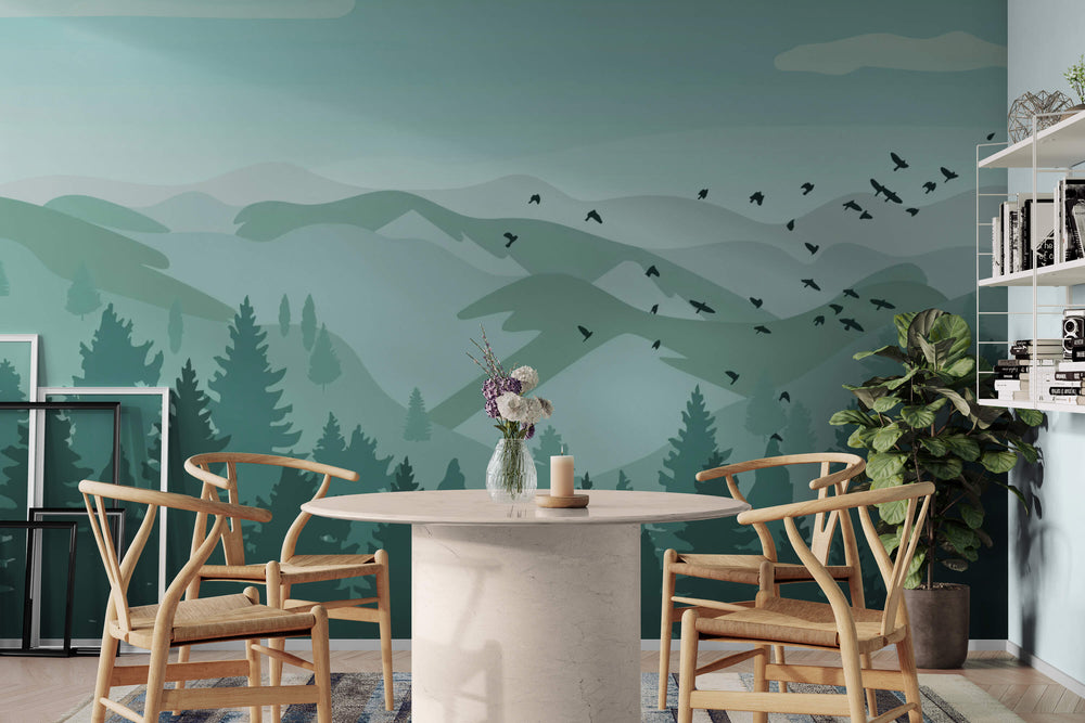 Majestic birds soar over serene forests and distant mountains in stillness.