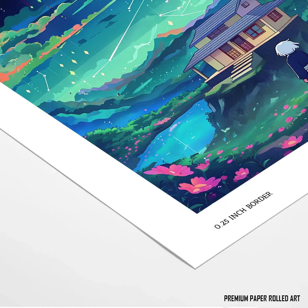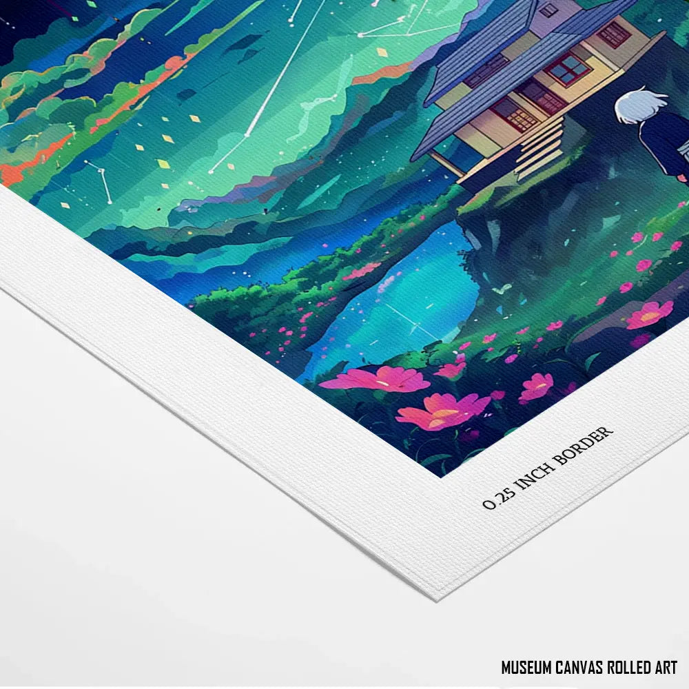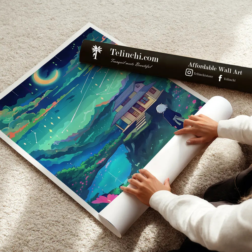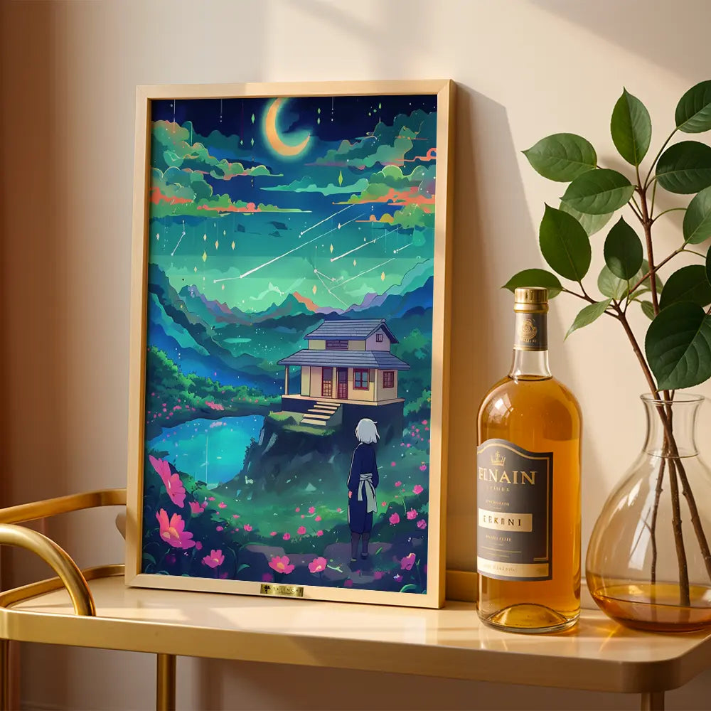 A magical depiction of a glowing moon and blooming flowers, bringing whimsy and wonder.