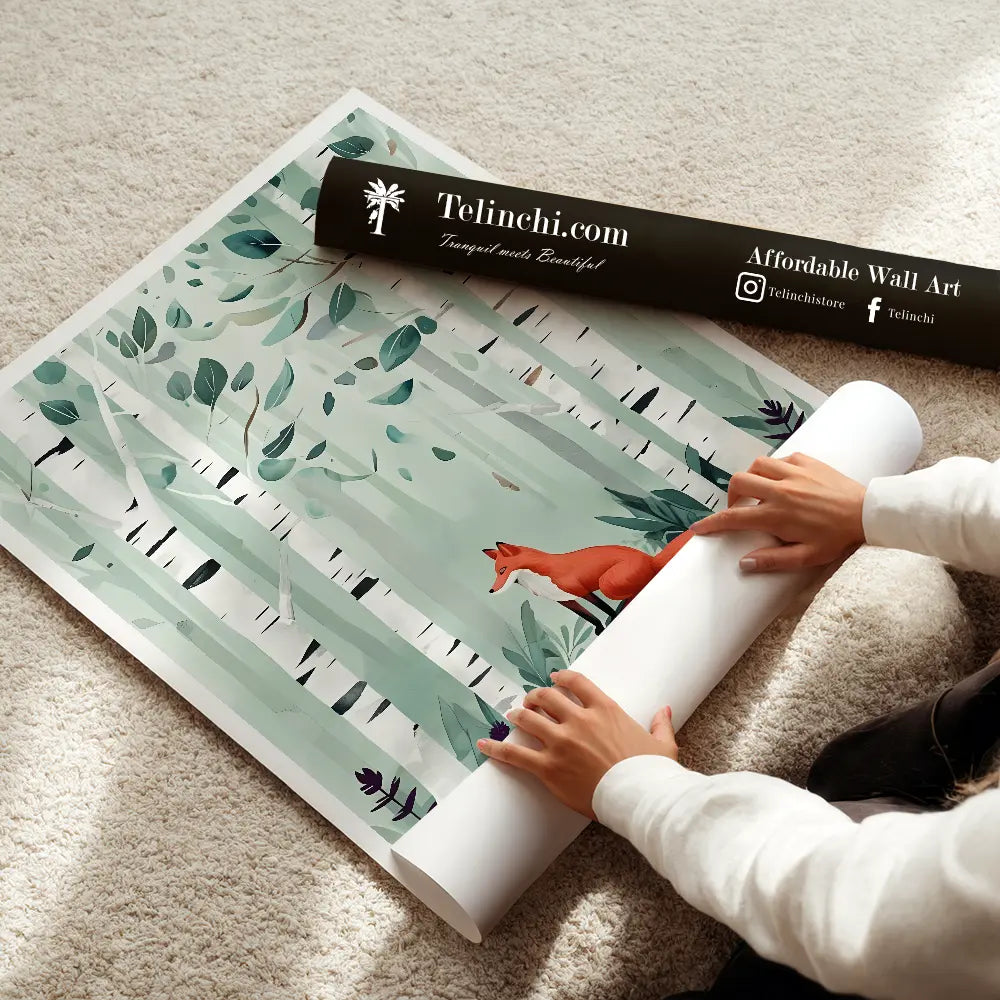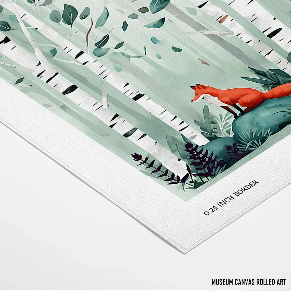 A bright fox seated in a tranquil birch forest minimalist yet bursting with personality.
