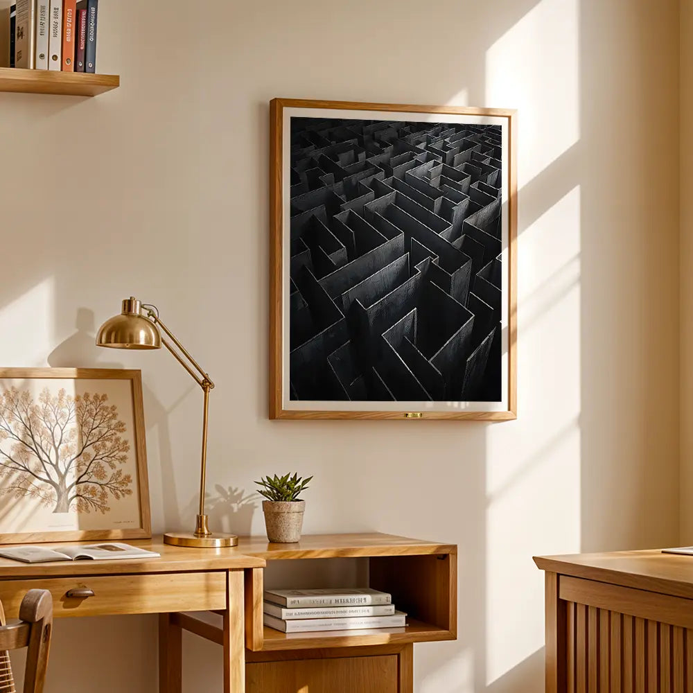 A complex labyrinth of high walls, embodying mystery and introspection.