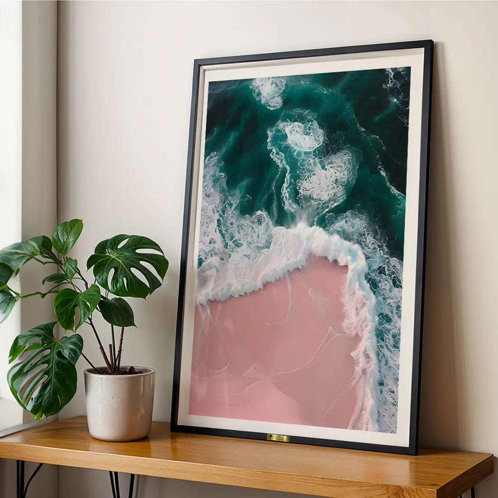A unique pink-tinted shore with frothy waves creating an artistic coastal view.