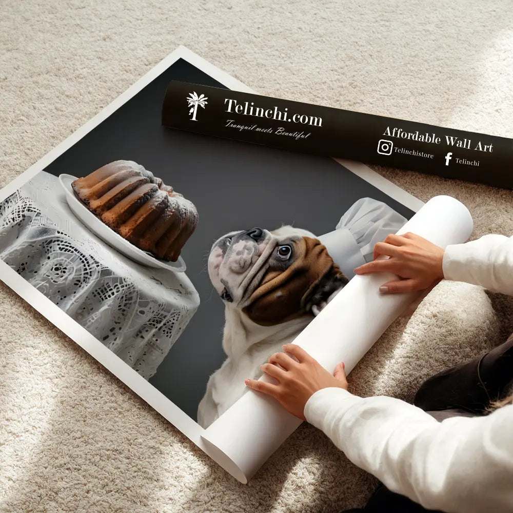 A cheerful bulldog in a chef’s hat admires a cake, radiating playful curiosity and culinary charm.