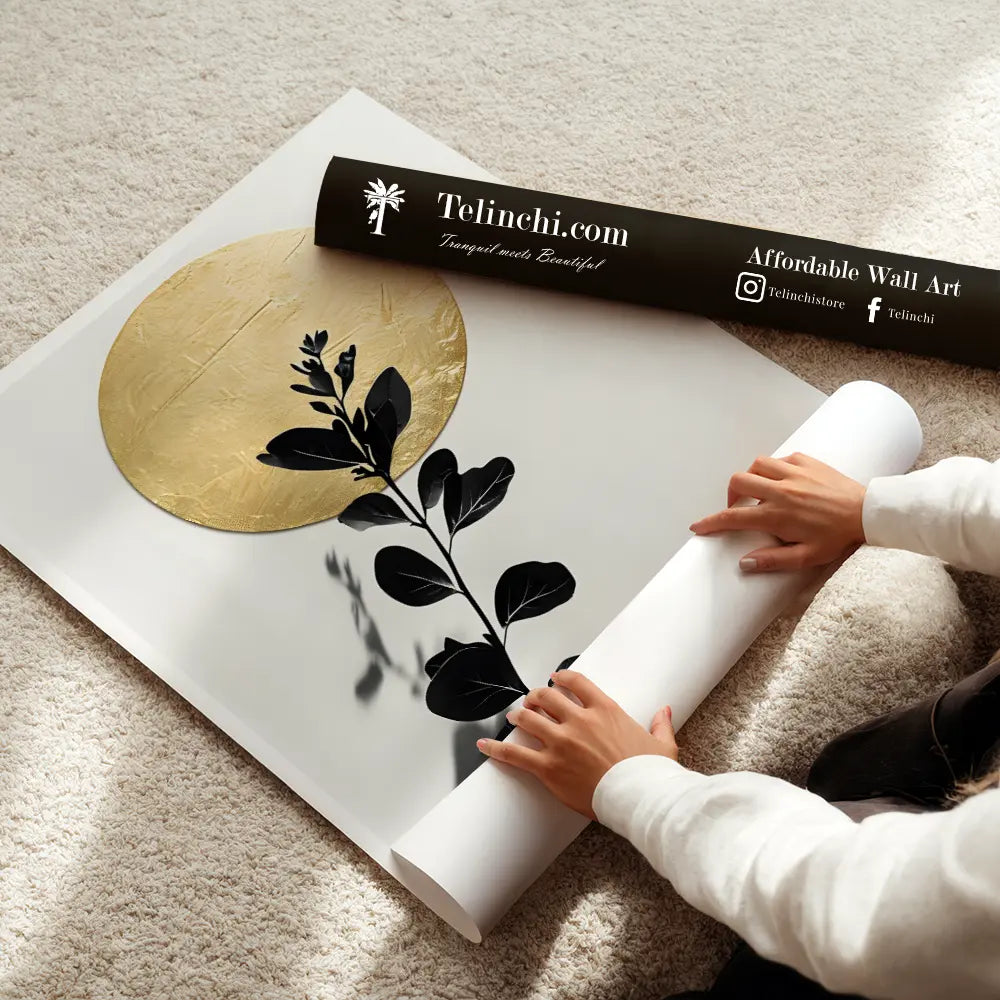A minimalist golden disc paired with a dark silhouette of leaves evokes timeless elegance.