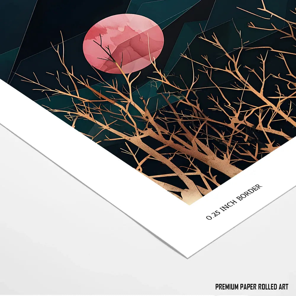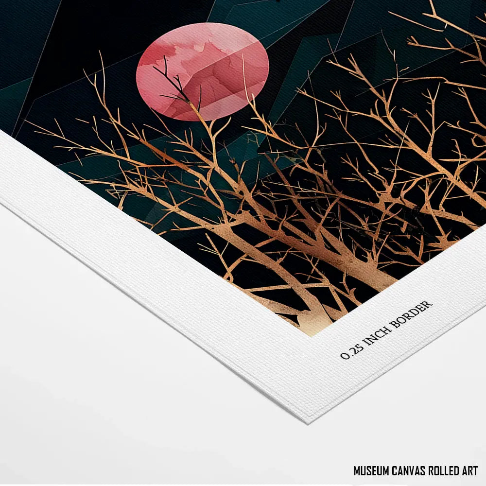 Ethereal trees silhouetted against a glowing moon, evoking mystery and serenity.
