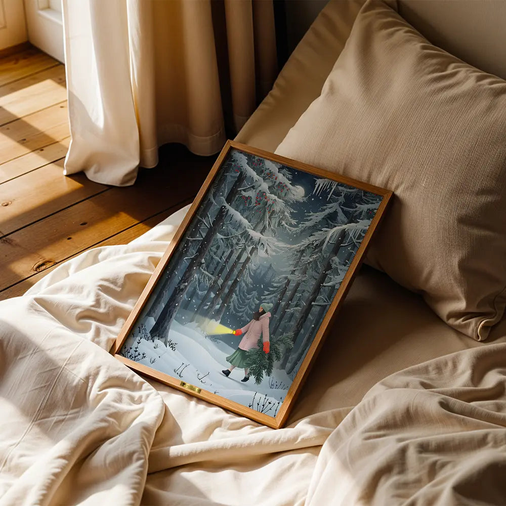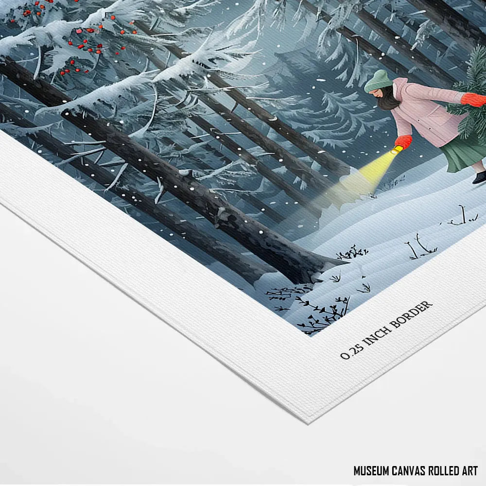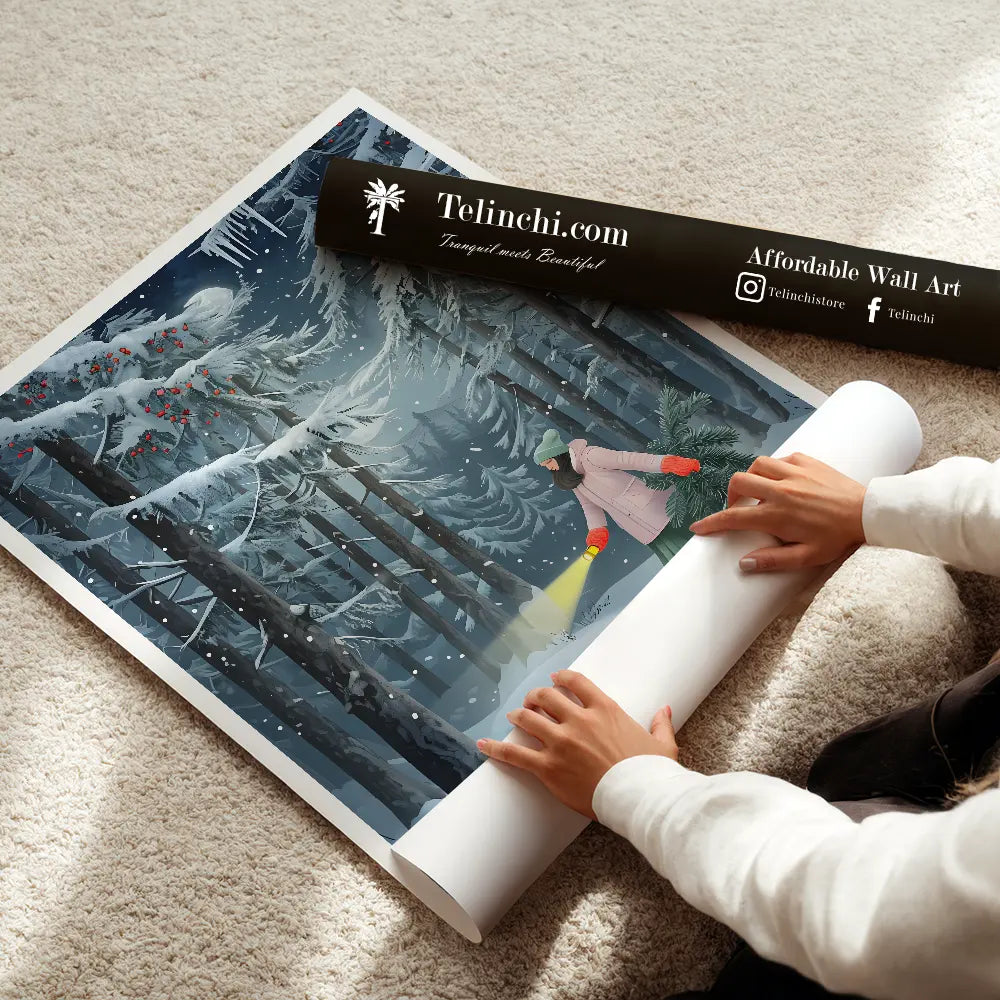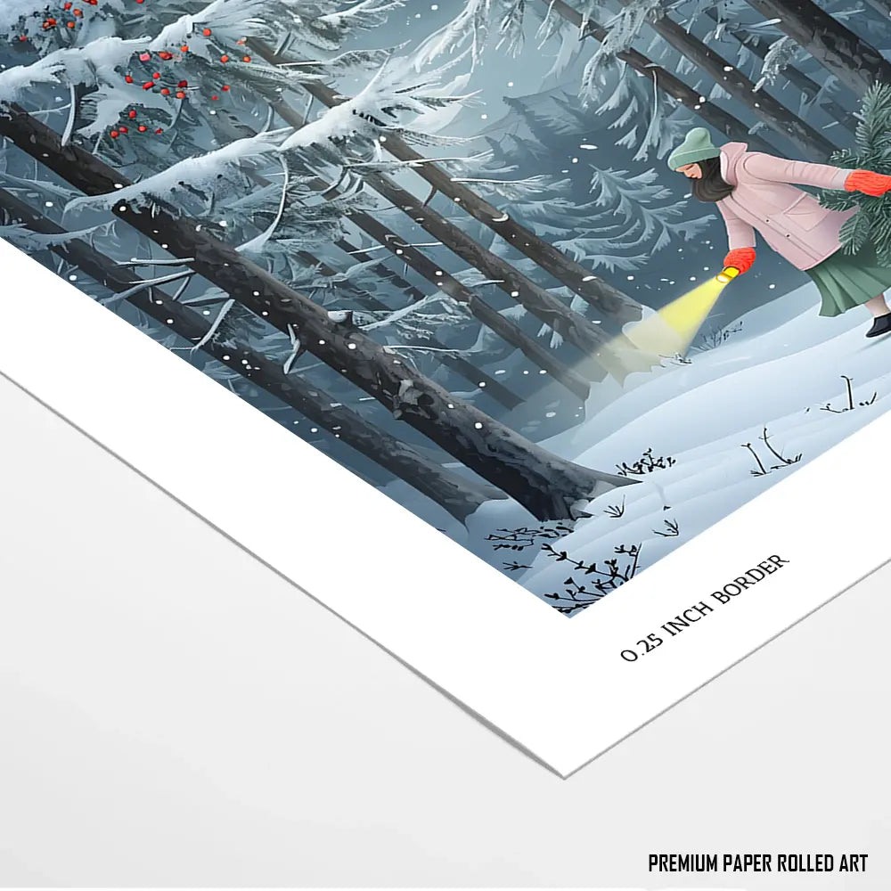 A lone adventurer with a flashlight explores a snowy forest under a moonlit sky—quiet yet inspiring.
