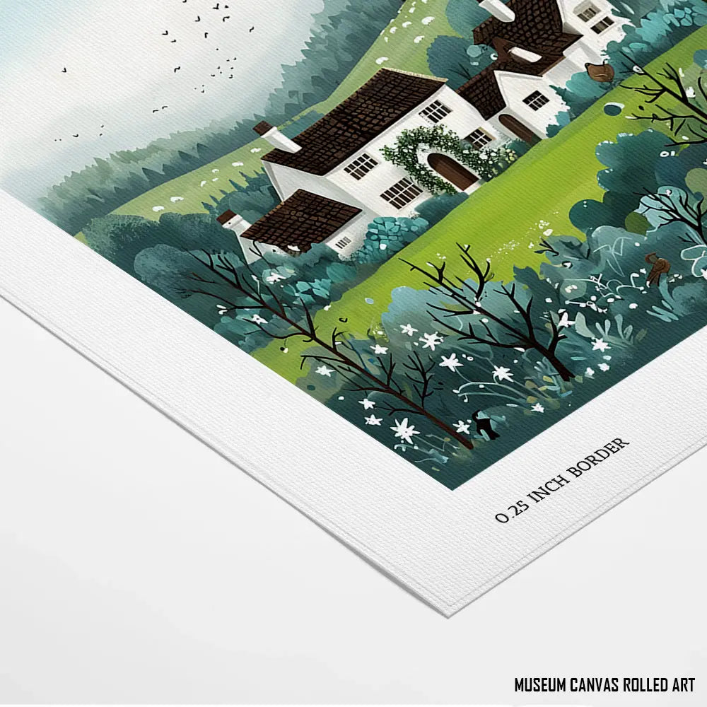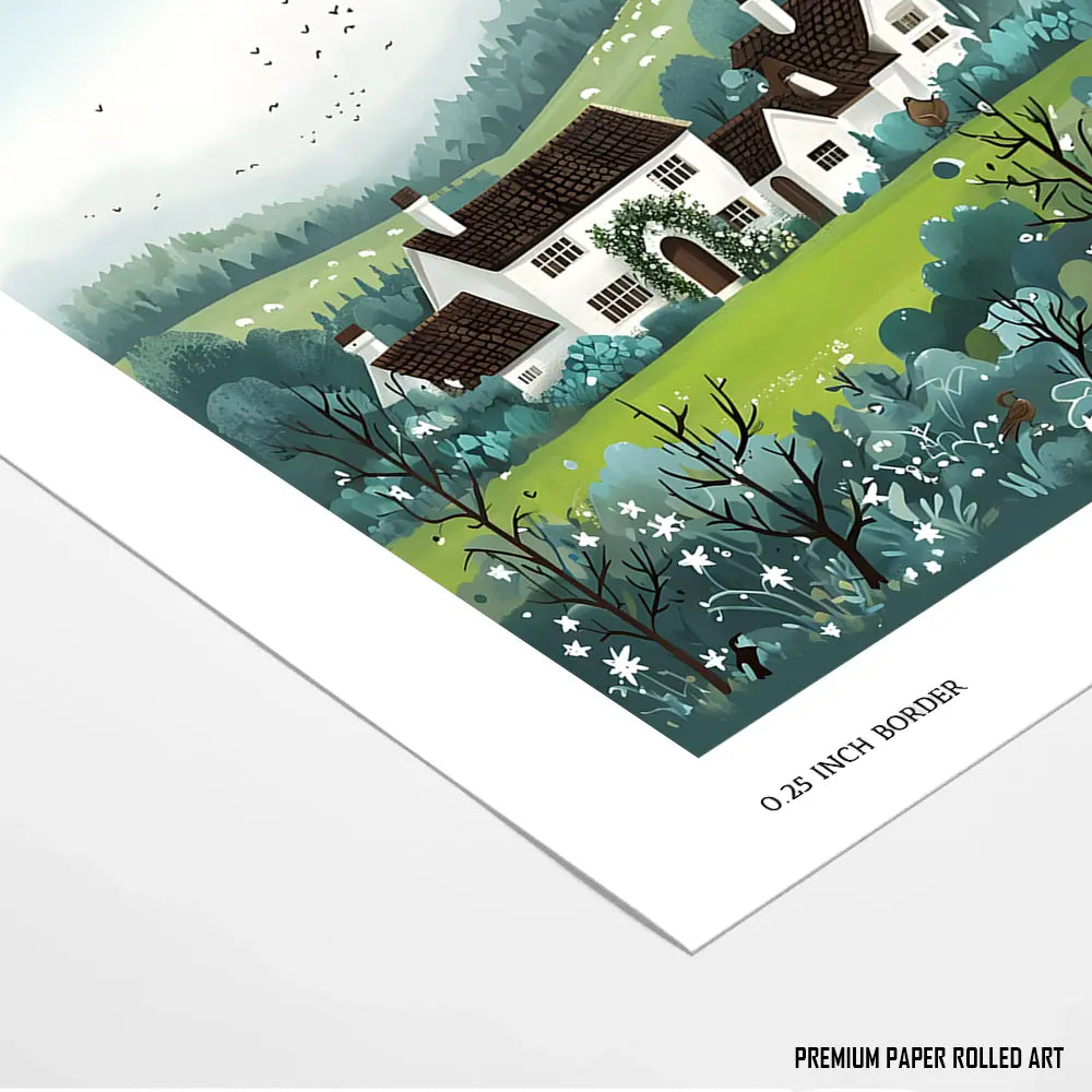 A peaceful countryside scene with sheep grazing under open skies and a rustic cottage.