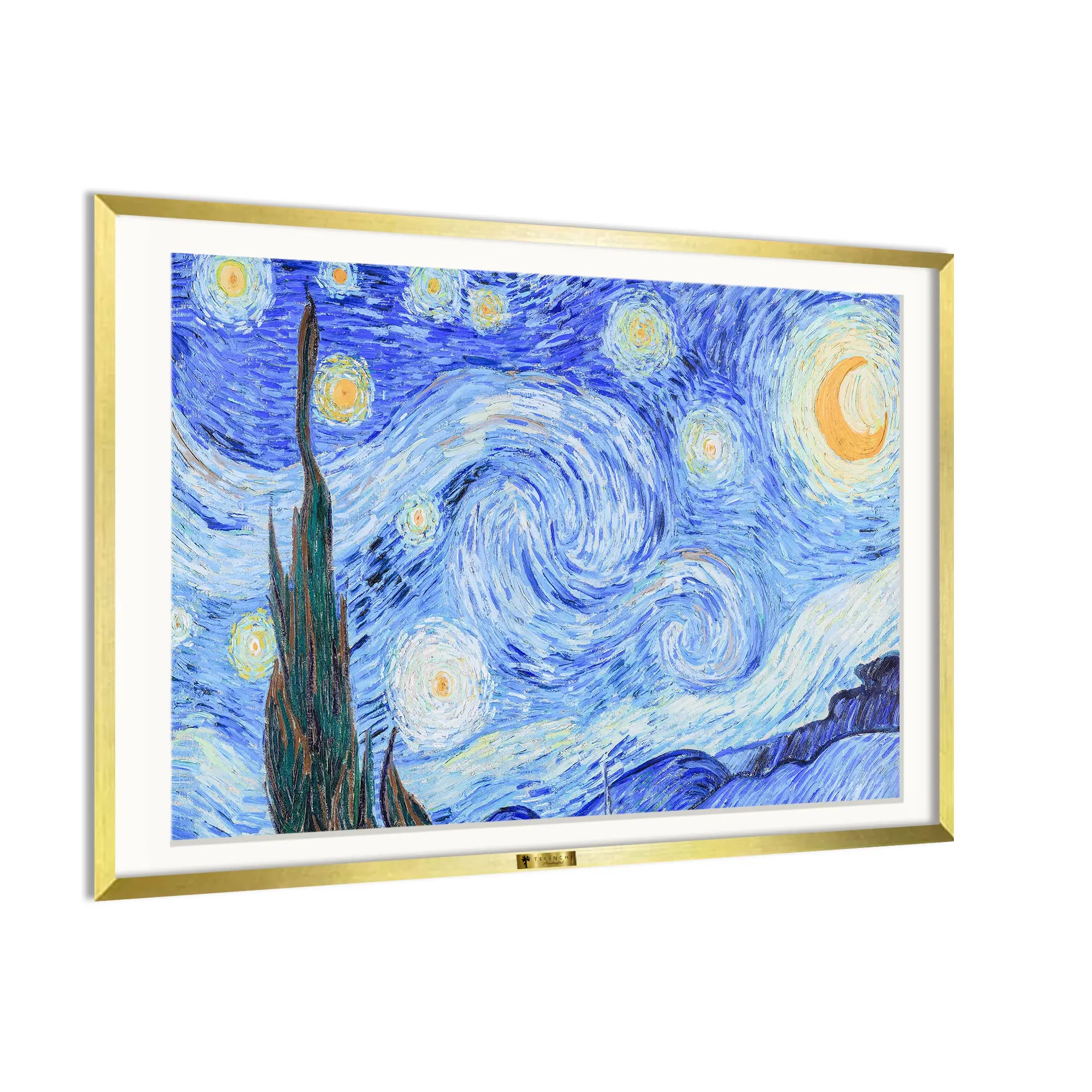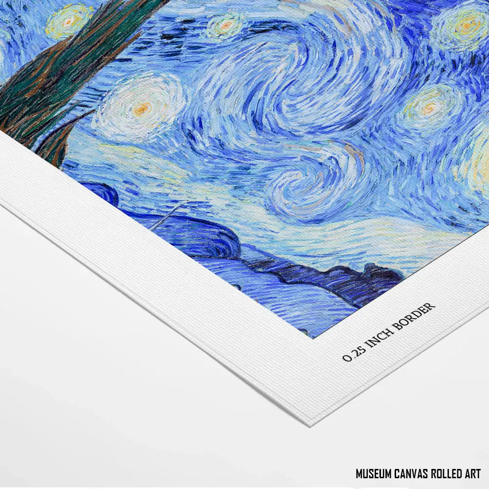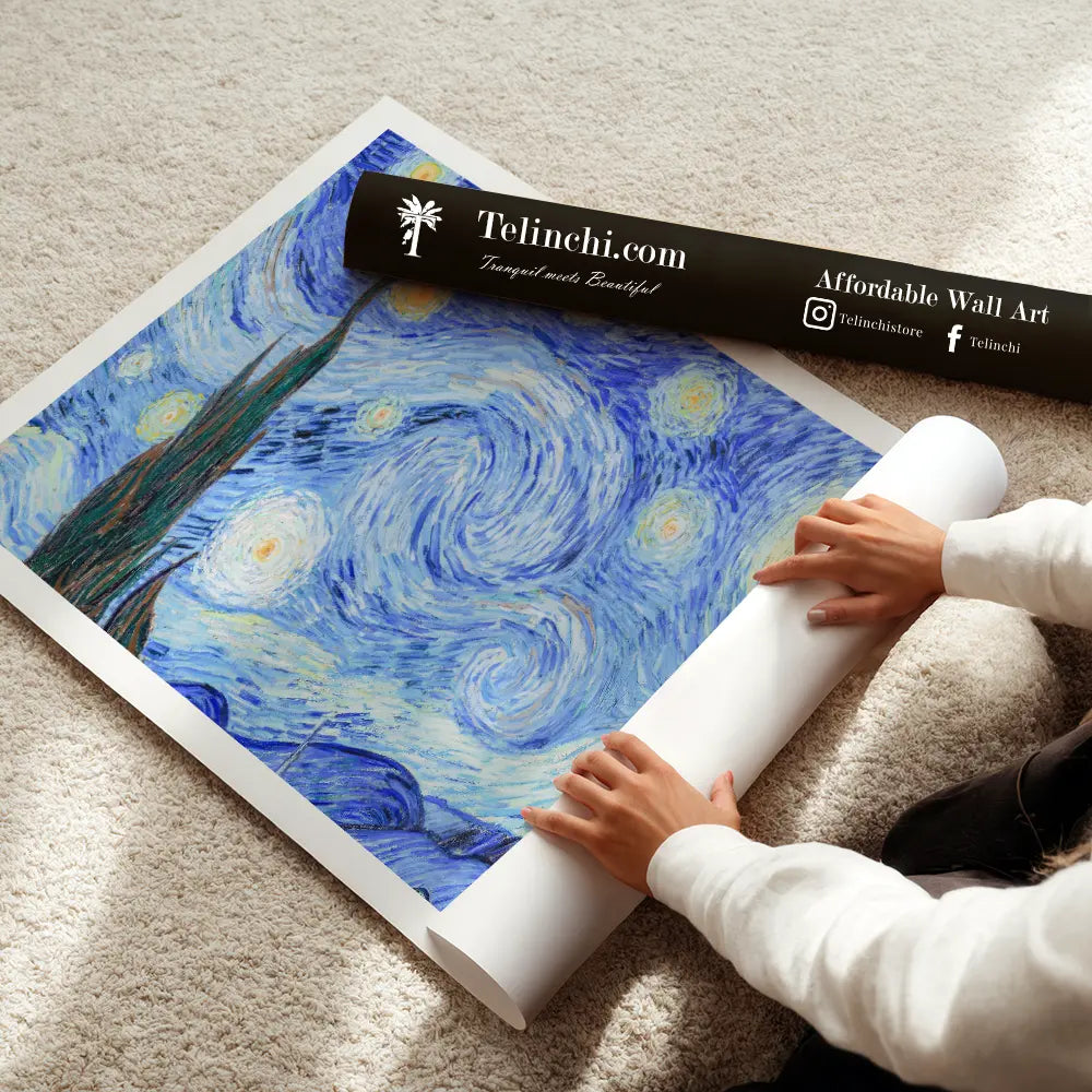 The swirling blues and yellows of a starry night enchant the viewer with their dreamy glow.