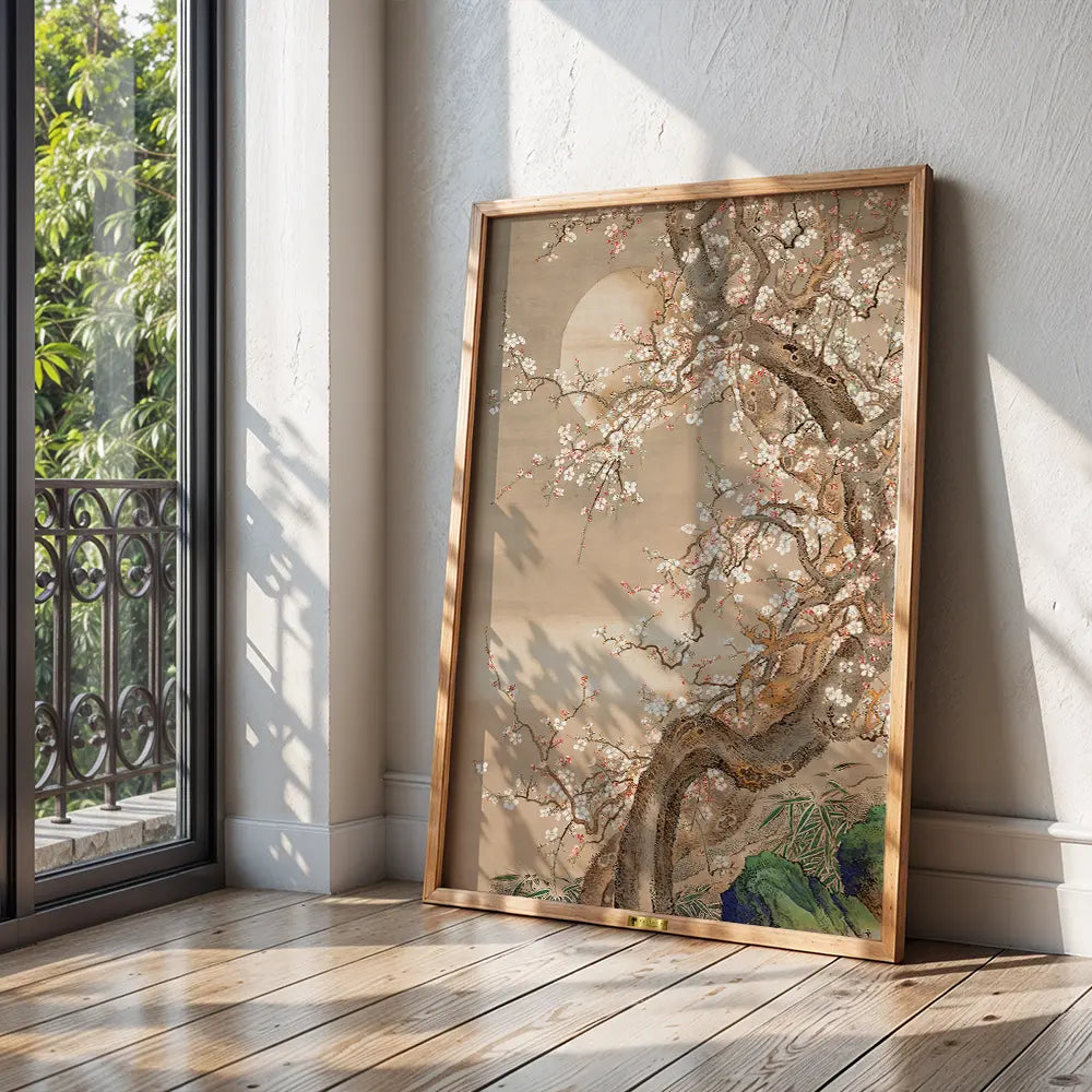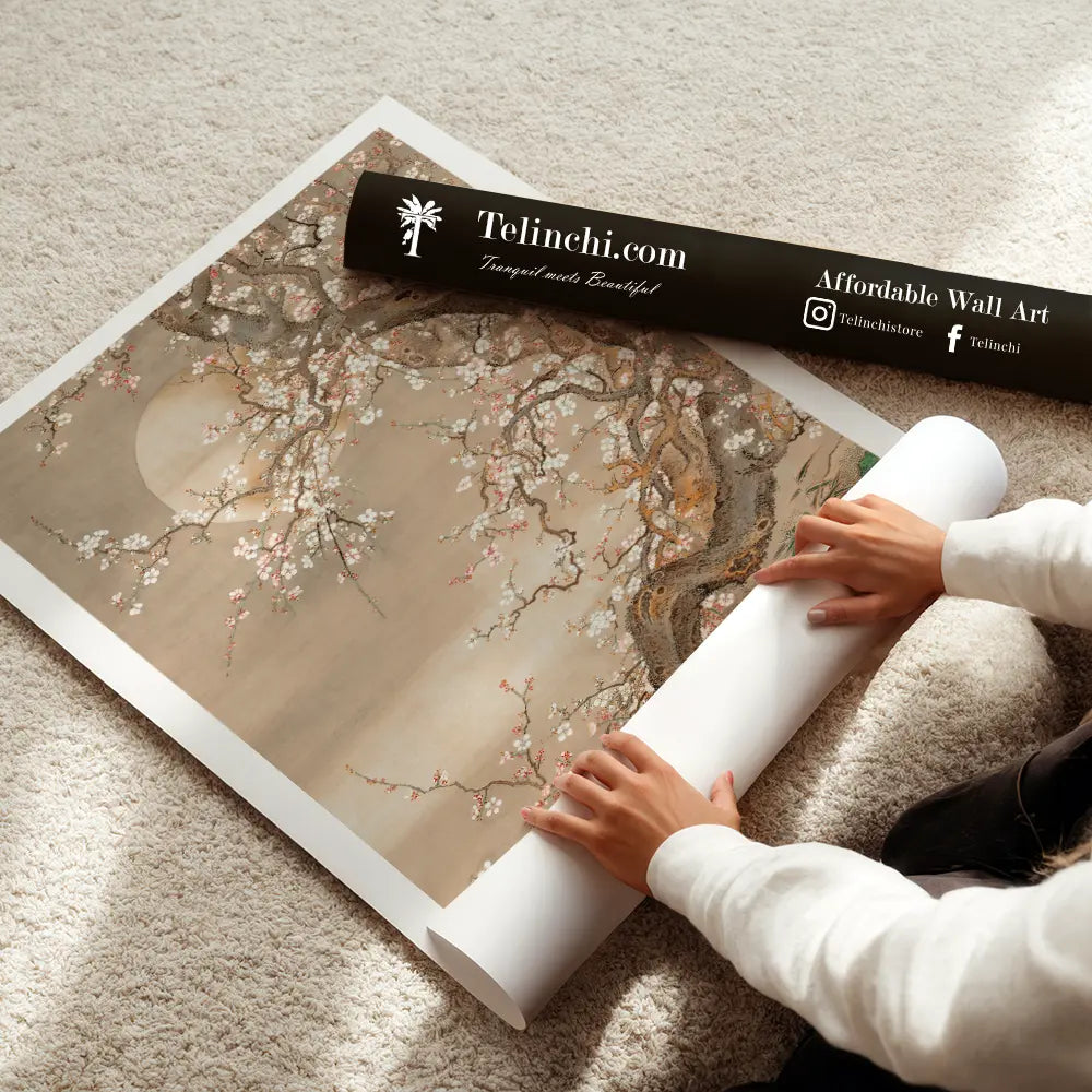A tranquil scene of a cherry blossom tree illuminated by the moon. The intricate details of the blossoms emphasize their fleeting beauty, a hallmark of Japanese aesthetics.