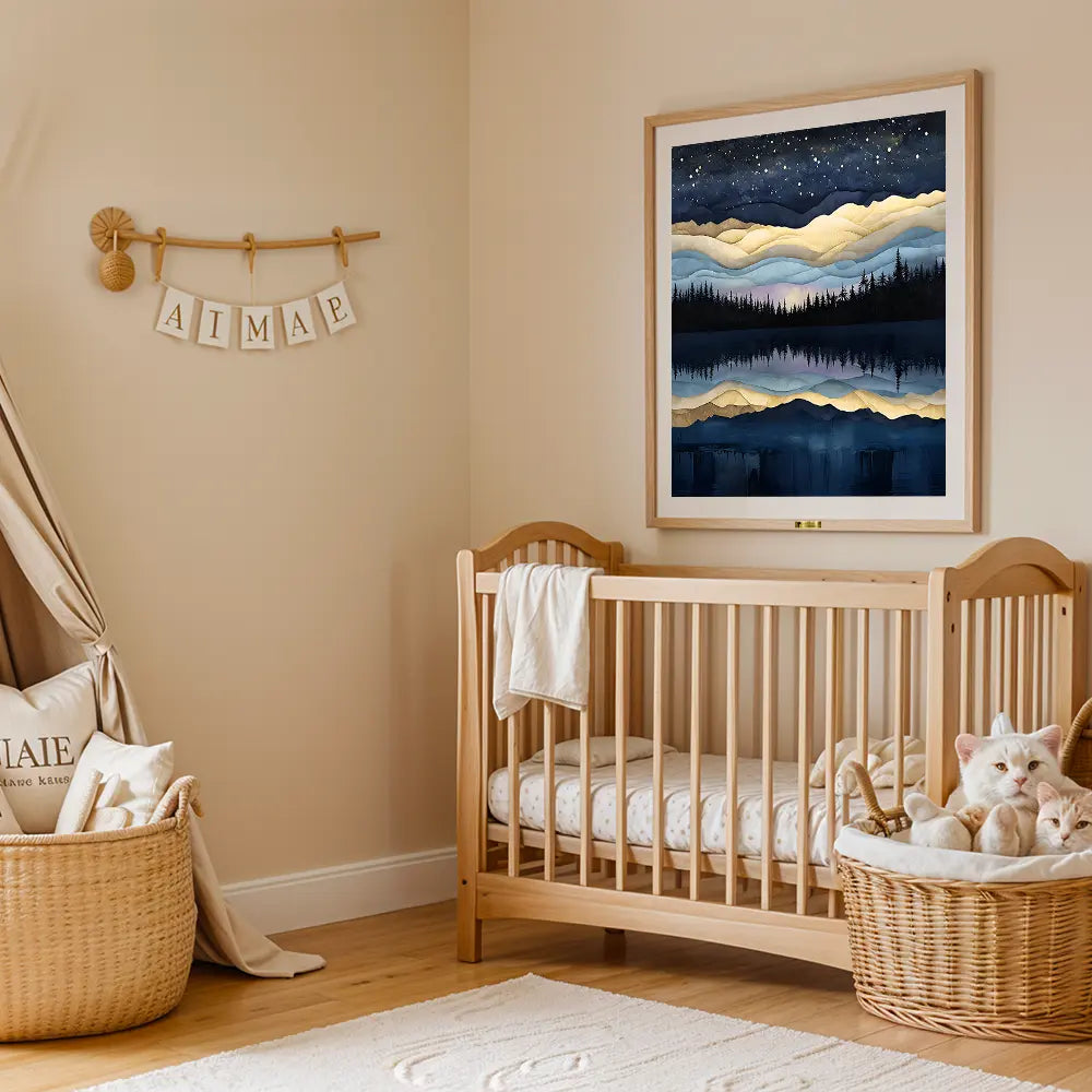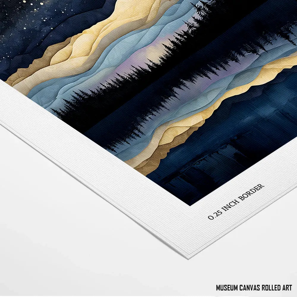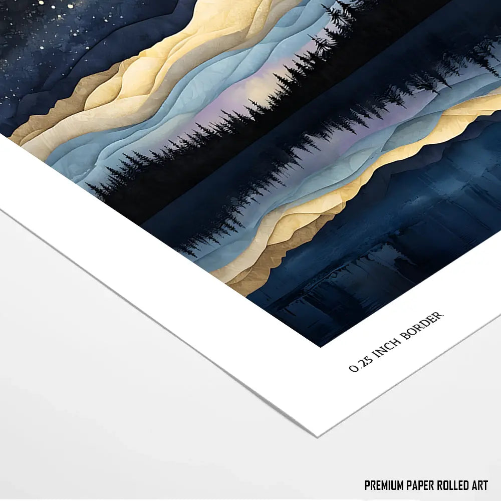 A magical landscape of mountains and forests reflected under the starlit sky.