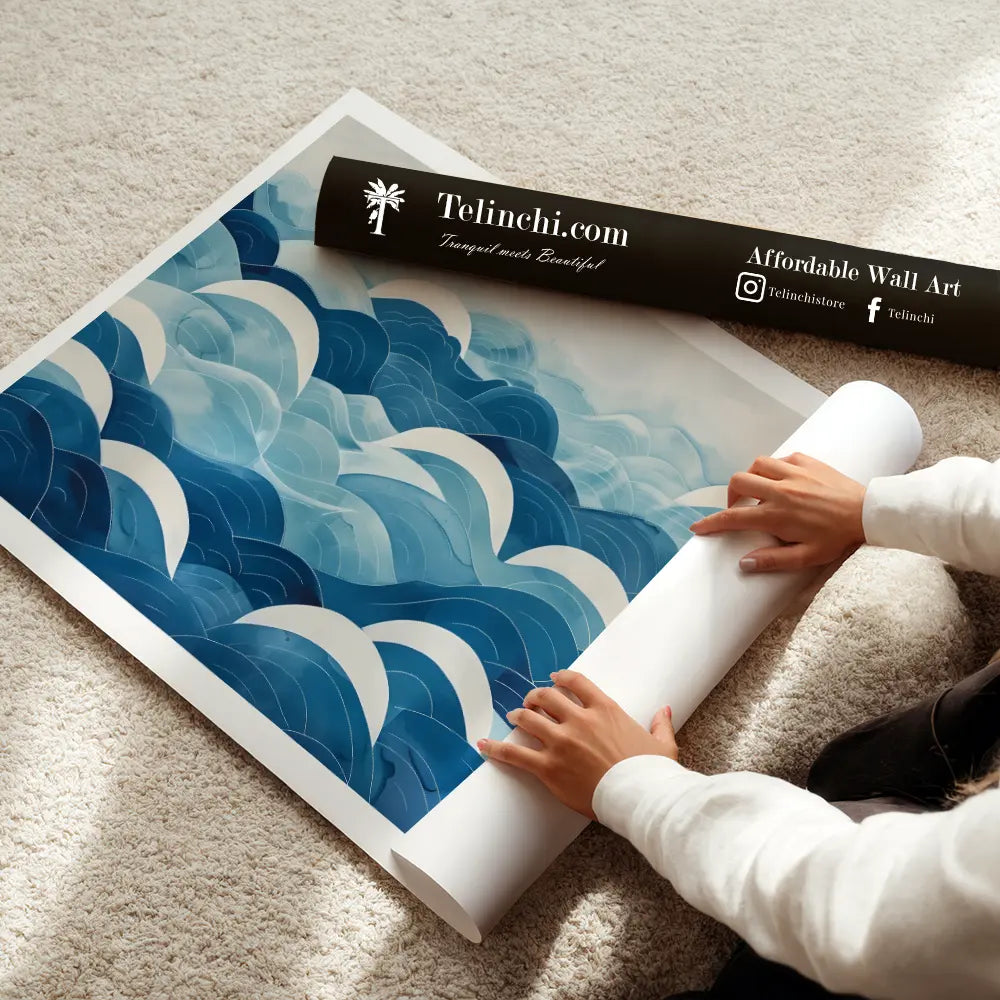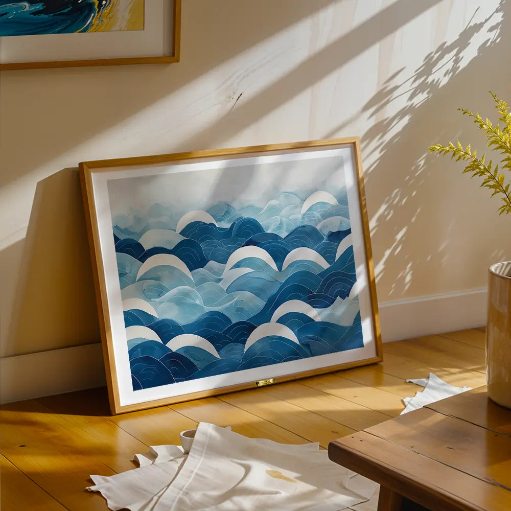 An abstract depiction of layered ocean waves in soft blues, bringing calm and serenity.